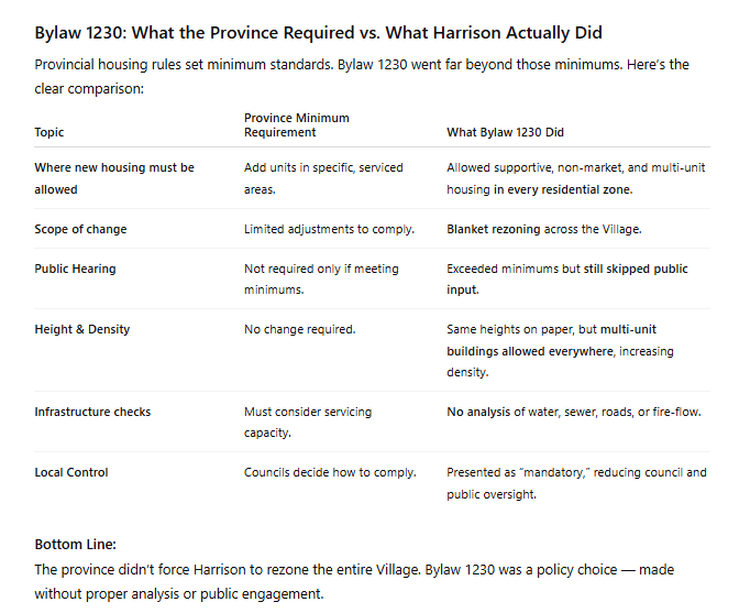 The bylaw lifts a requirement for a “public hearing” in certain cases when these zones or uses are amended — in line with recent provincial legislation on housing. For example, a notice states: “A local government must not hold a public hearing on a proposed zoning bylaw if …” (which is referenced in the staff memo) harrisonhotsprings.ca+1