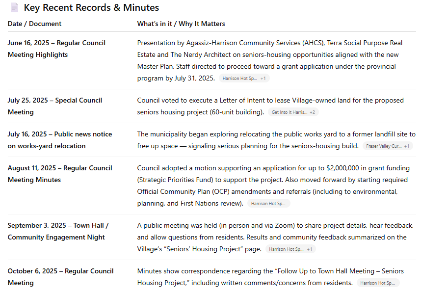 Community reactions: earlier public consultation showed seniors’ housing was a high priority, but some residents remain skeptical about aspects like parking availability, impact on neighbourhood infrastructure, and village staff becoming landlords (as earlier debates indicated when civic+housing combos were discussed).