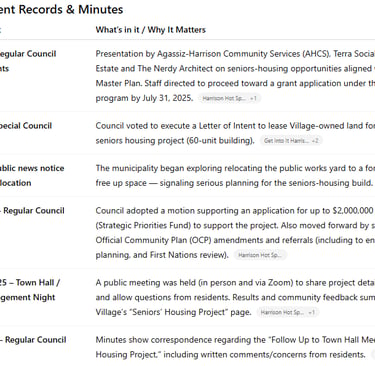 News coverage and commentary (from local reporting by Fraser Valley Current and Agassiz‑Harrison Observer) provide further context and reporting on council decisions and public reaction.